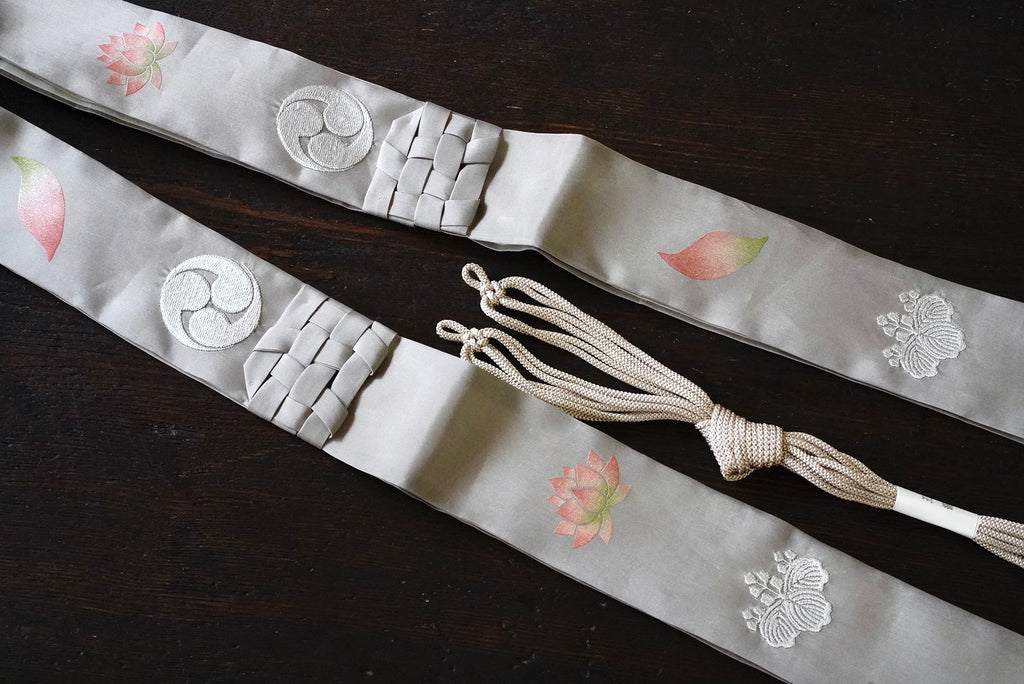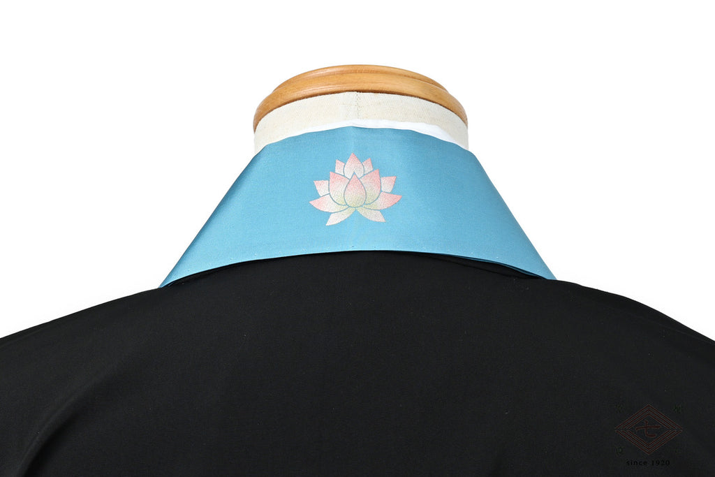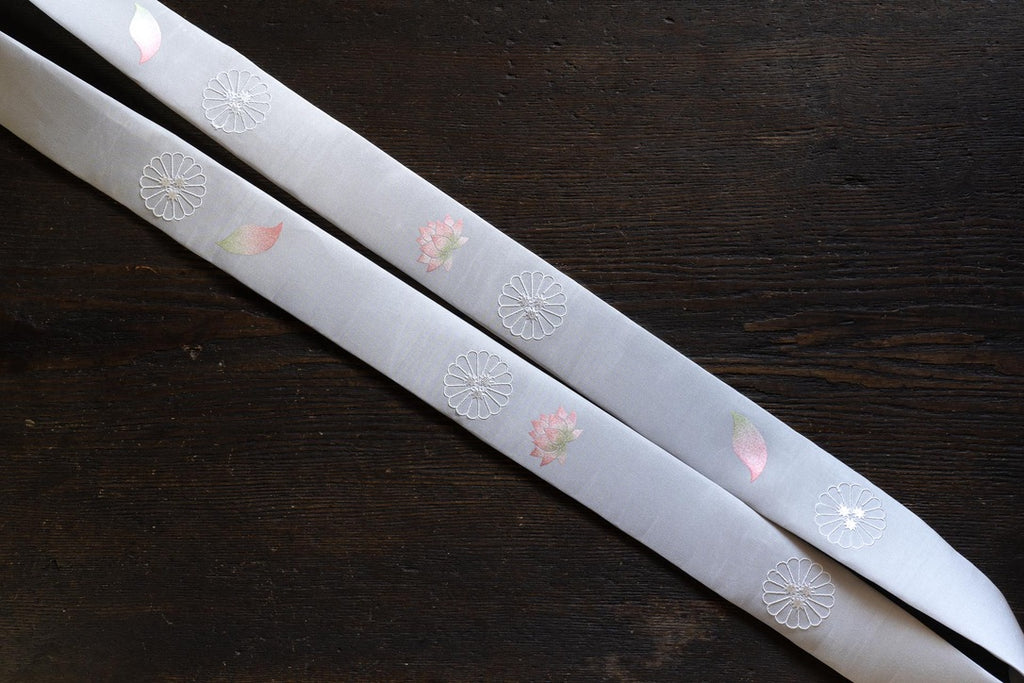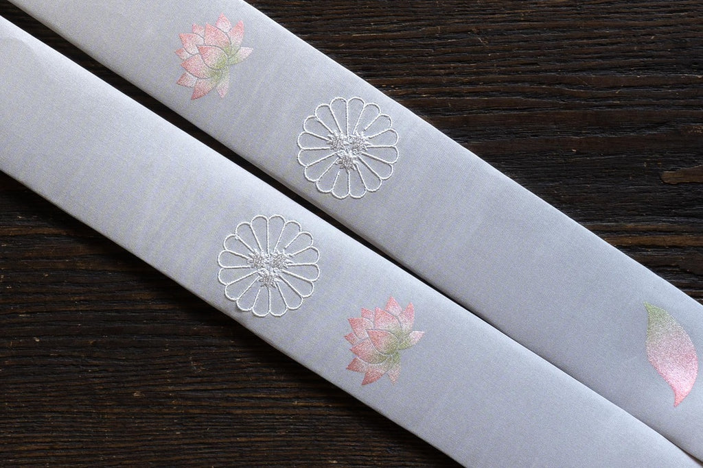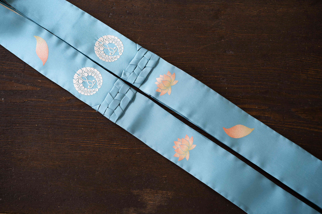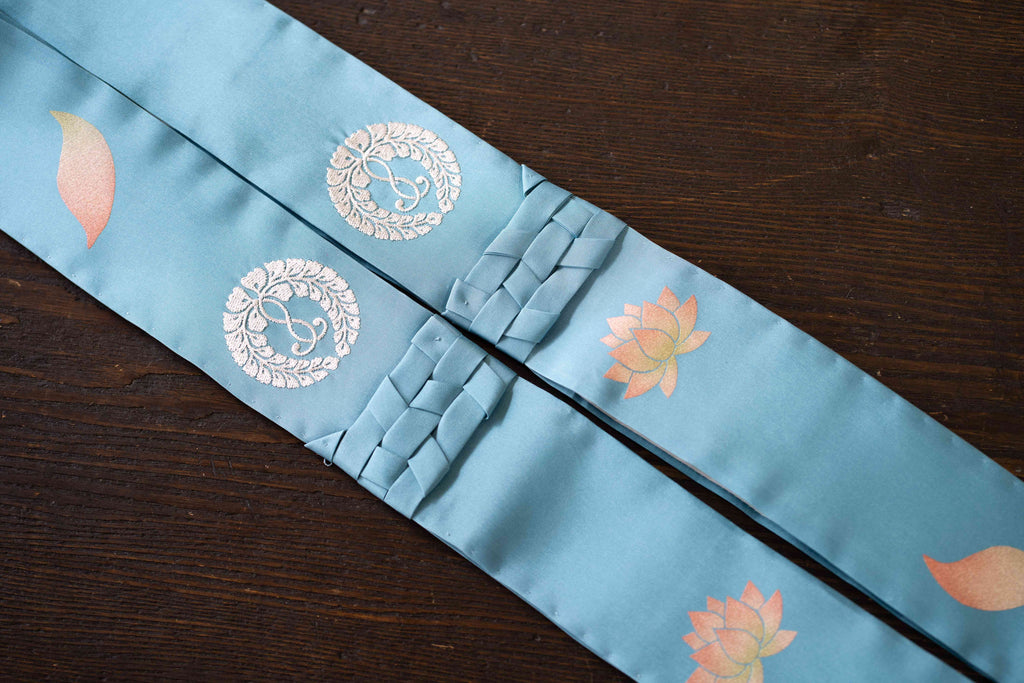銀鼠とみ空、どちらも正絹ならではのしなやかな質感が、金彩の蓮に「命」を吹き込みます。伝統的な蓮の図案を、あえて余白を活かしたモダンな配置にすることで、今の時代にふさわしい洗練された輪袈裟に仕立て上げました。